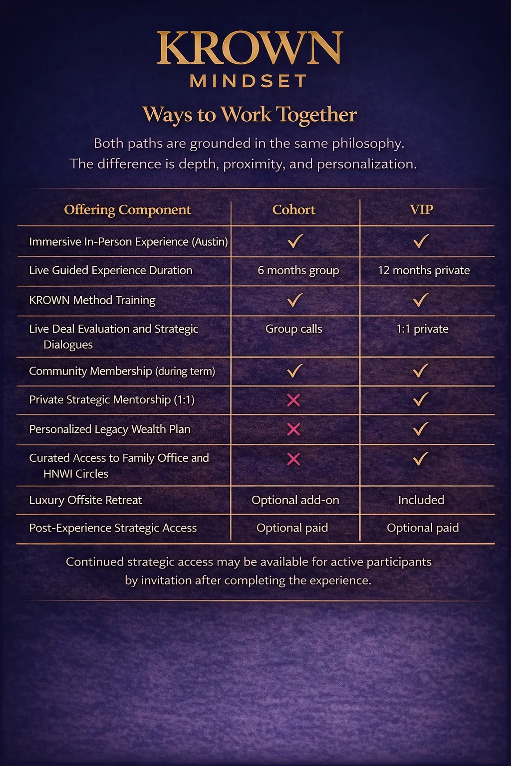 No. While multifamily apartments are one vehicle explored, KROWN Mindset is not a tactics-first real estate course. The work focuses on identity, judgment, and disciplined decision-making so you can evaluate opportunities thoughtfully and act with confidence over time.